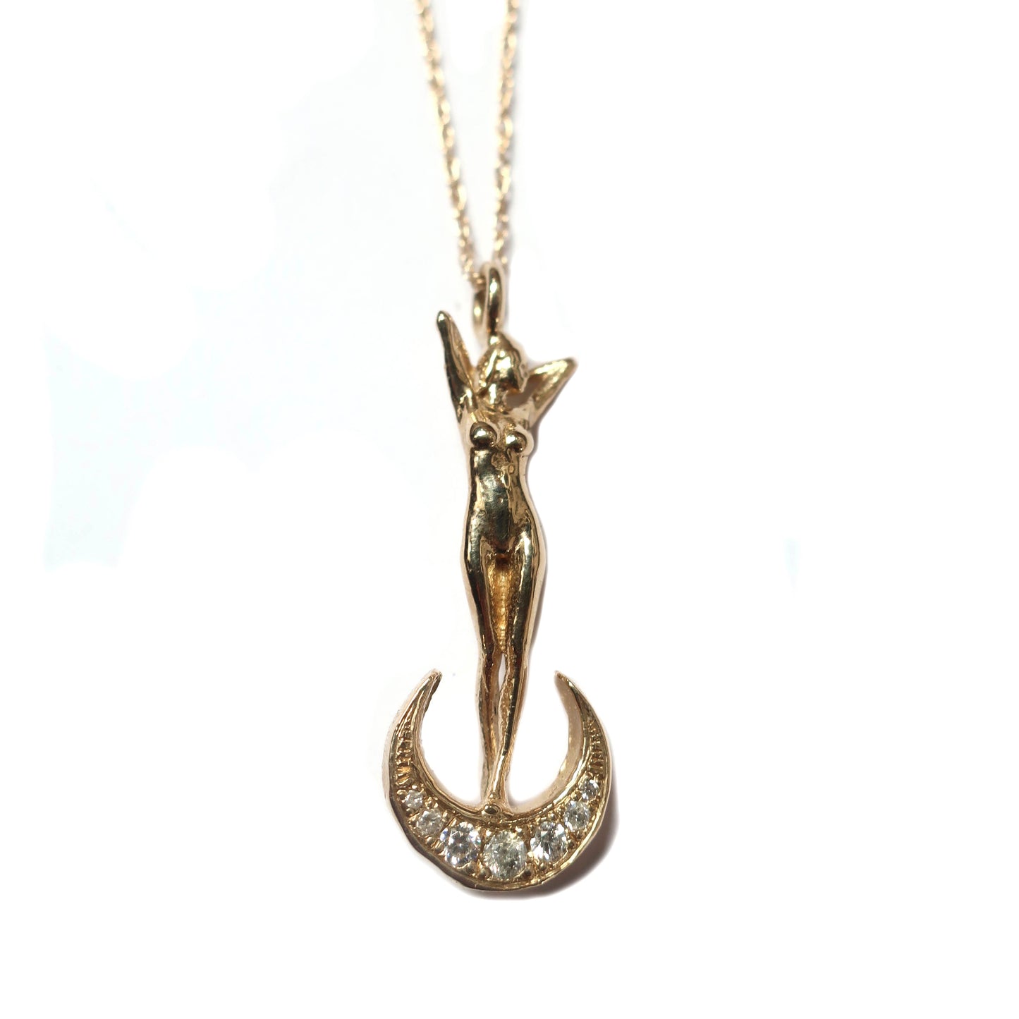Beautifully sculptured solid 14k gold Siren 30mm high pendant necklace with a 20 inch gold chain. Impeccably detailed with pave diamonds set on a luminous crescent.