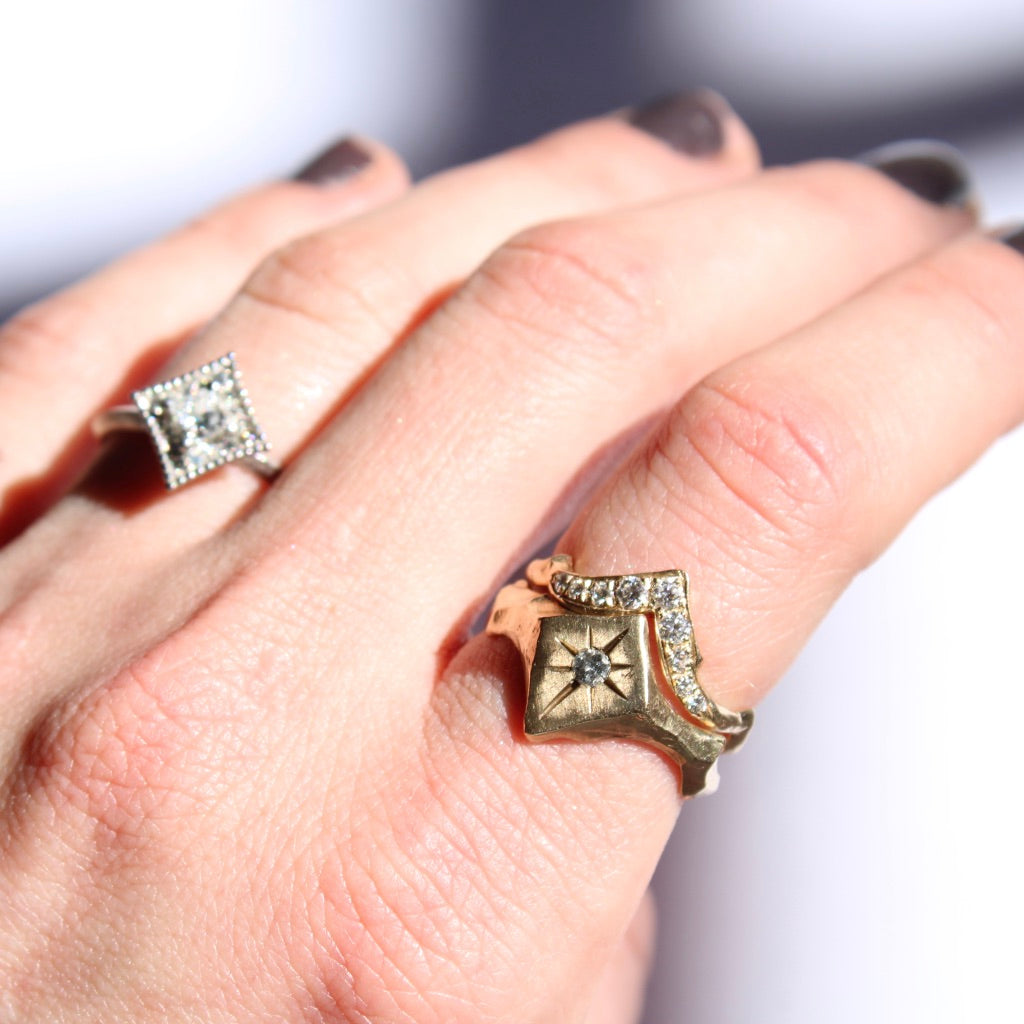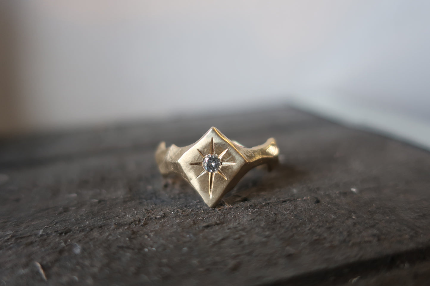 Solid 14k gold signet with star engraving and 2.5mm salt and pepper center diamond.