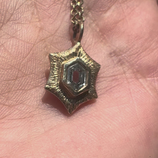 This beautiful hand engraved and set diamond necklace is cast in solid 14k gold and features a .45 carat bezel set natural hexagon diamond.