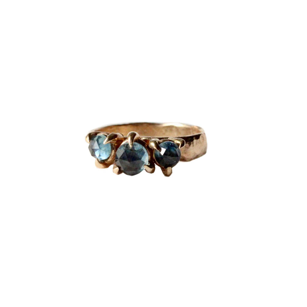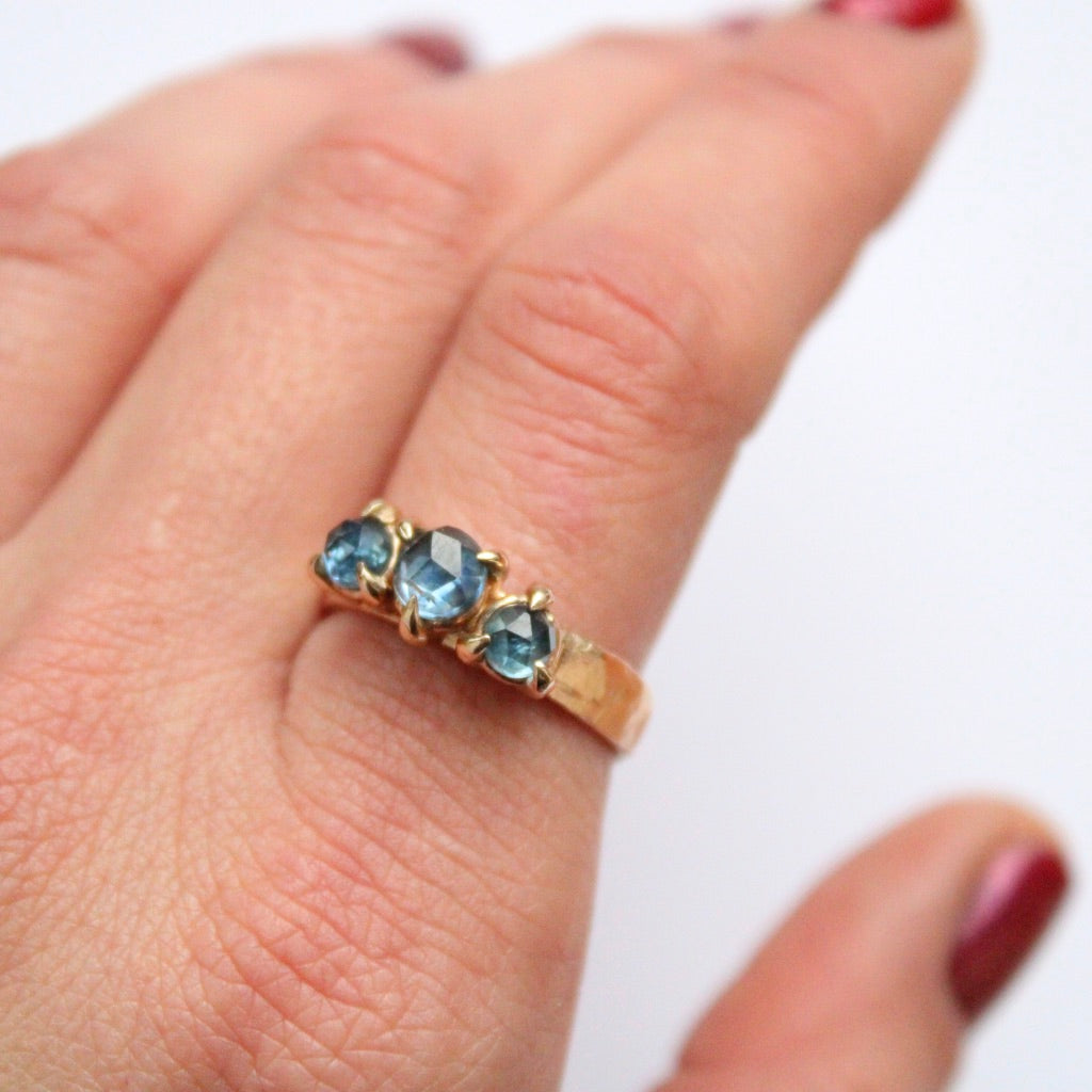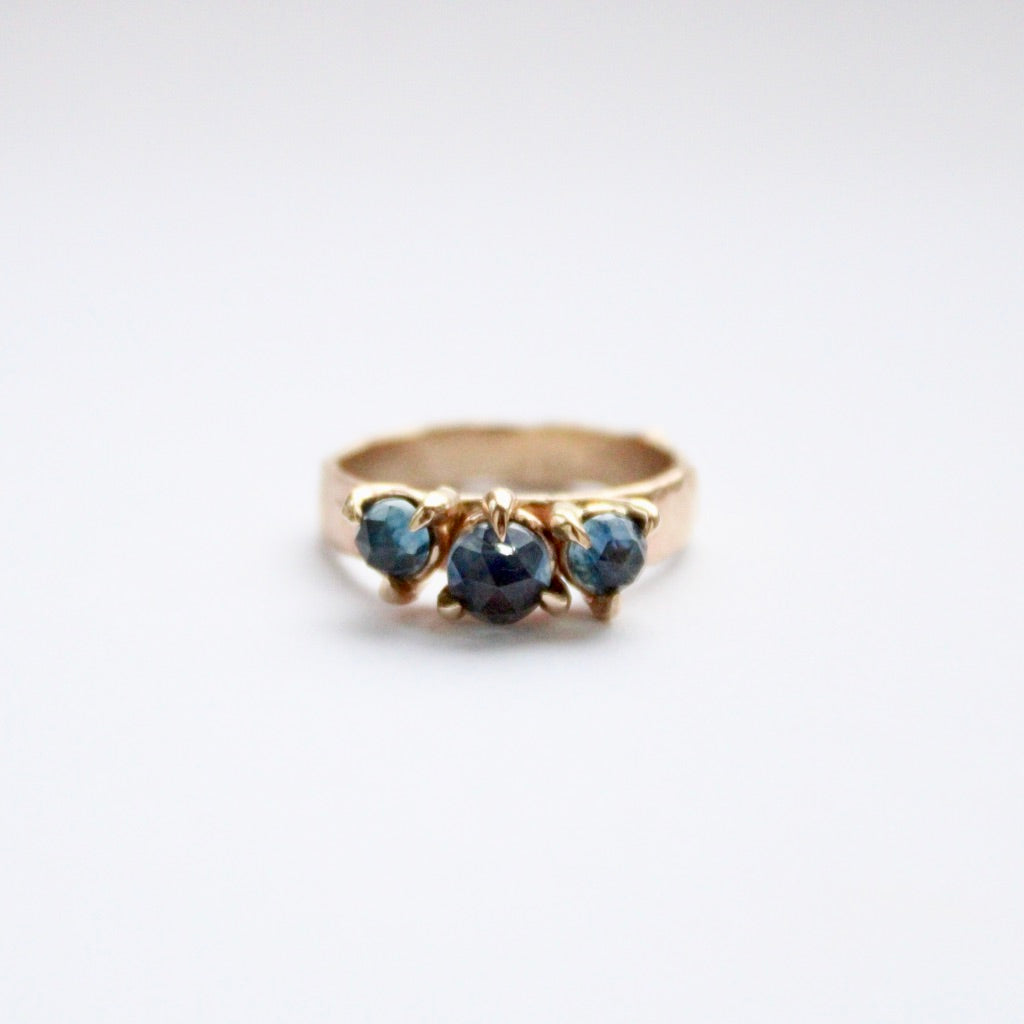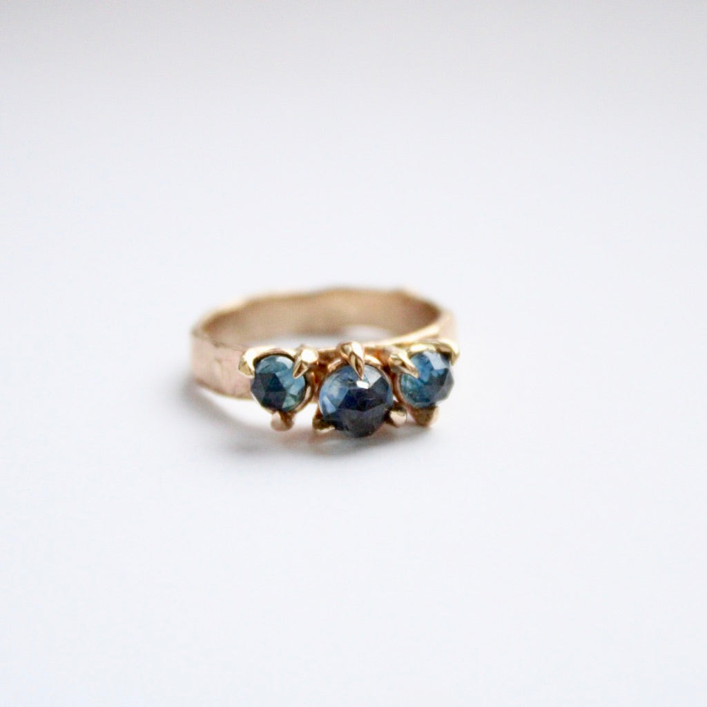Handmade hammered band with 5mm and 4mm rose-cut sapphires.