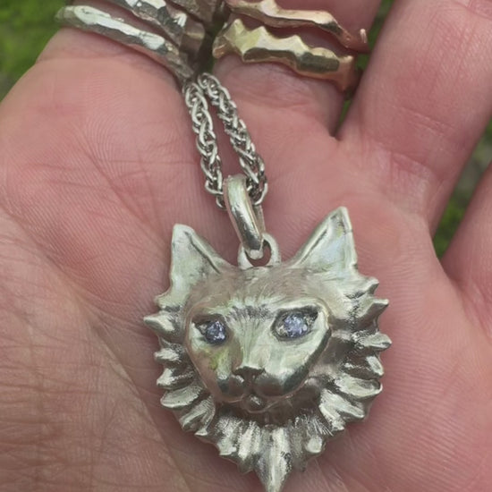 This piece is 21.5 grams of solid sterling. This piece was meticulously sculpted after my own feline friend and I emphasized a flowing mane and set faceted tanzanite to create glowing eyes. This piece is one of a kind and comes on a wheat24 inch chain .