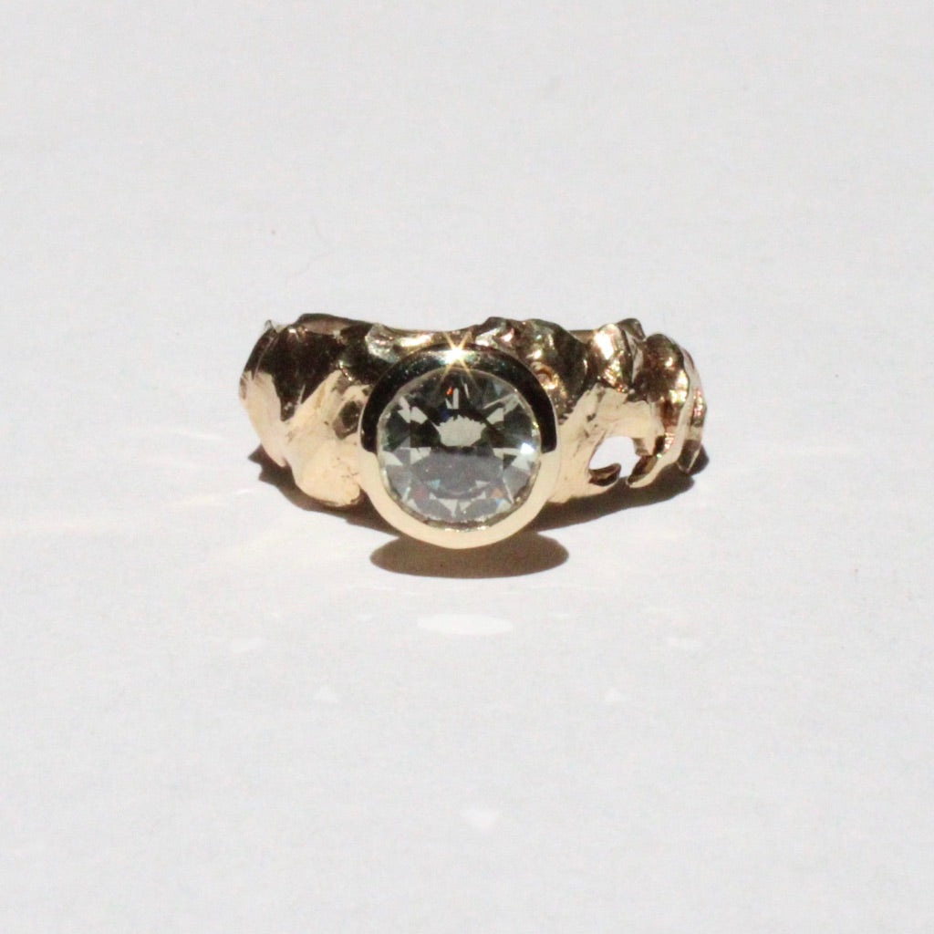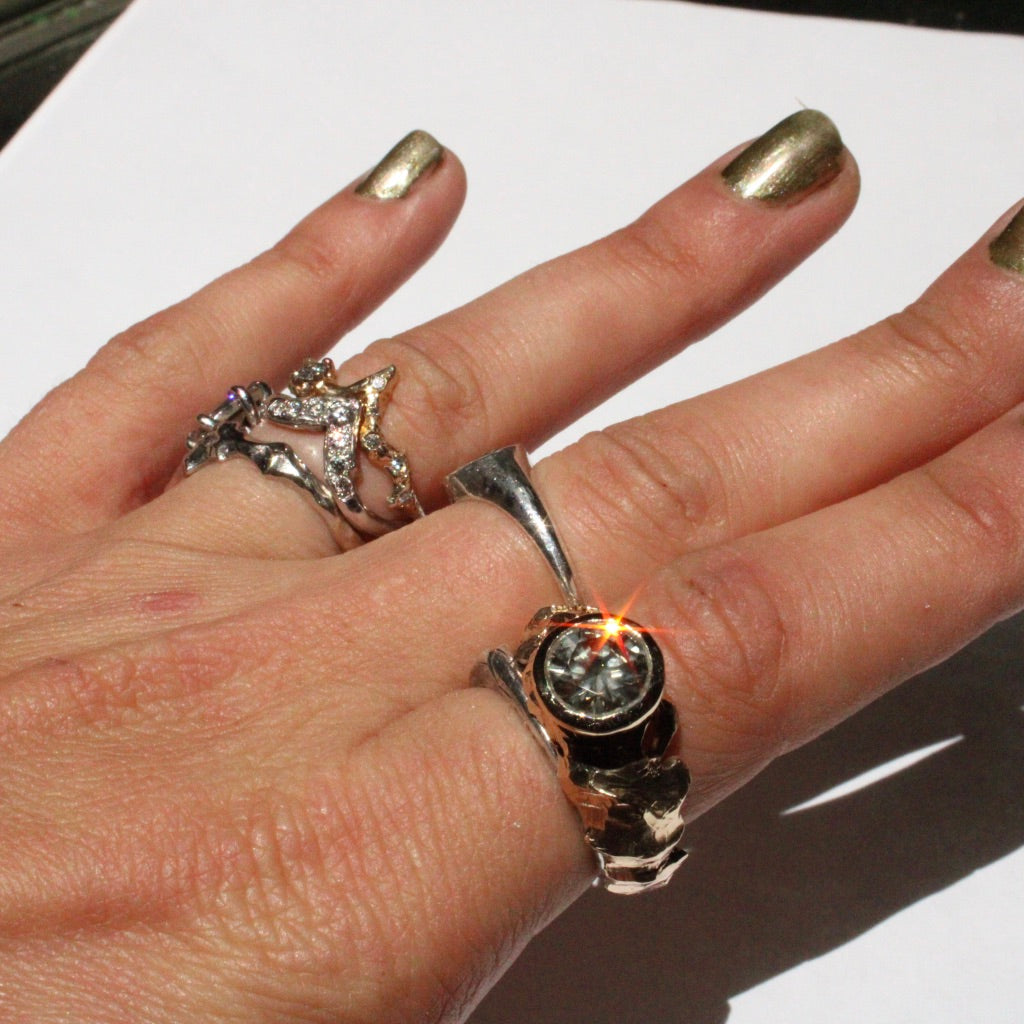 This gorgeous one of a kind hand carved diamond ring features a two carat grey diamond with report, bezel set in 14k gold. This piece is a statement with a unisex style, the upmost detail throughout and a style like none other. This is a size 8.25. Please reach out for sizing options and additional questions.