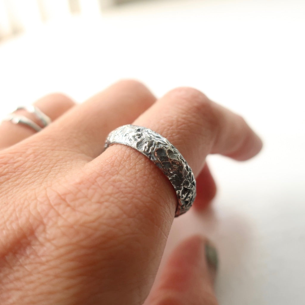 Sterling silver unisex band that features texture throughout. This ring is 6mm wide and 3mm thick with a wonderful weight in solid sterling silver.