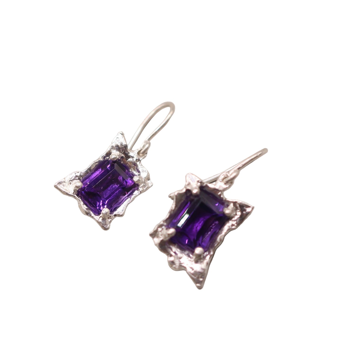 These sterling silver earrings are hand sculpted to encase these emerald cut dark amethyst gemstones. On sterling silver earrings hooks.