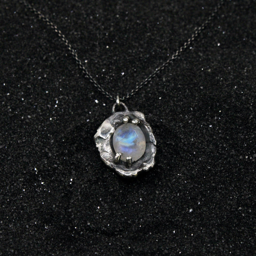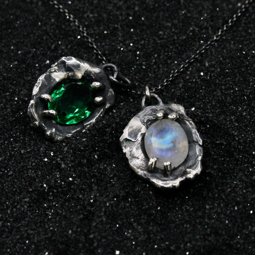 10x8 faceted gemstone set in sterling silver on a silver chain. Fully oxidized. Chain is 20 inches