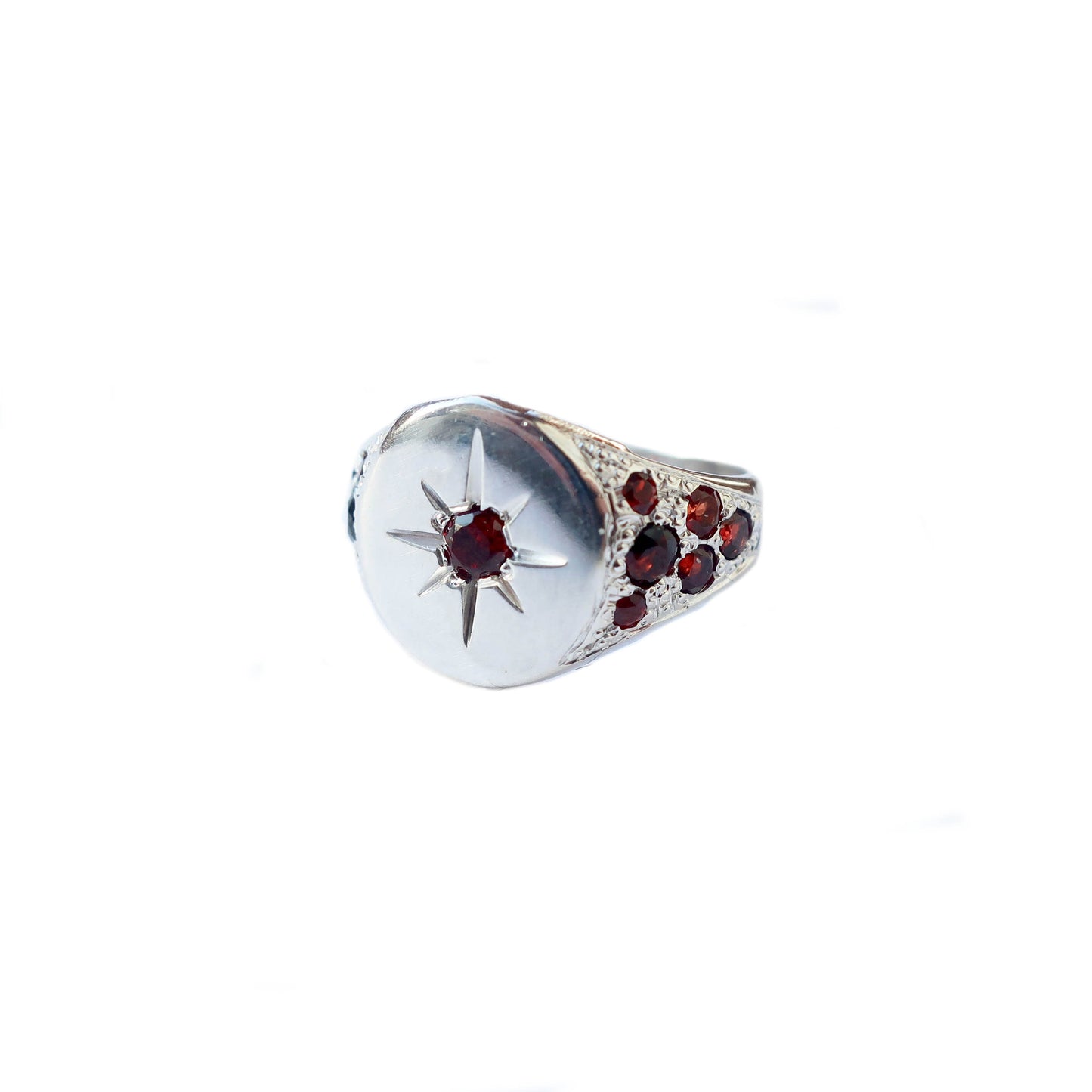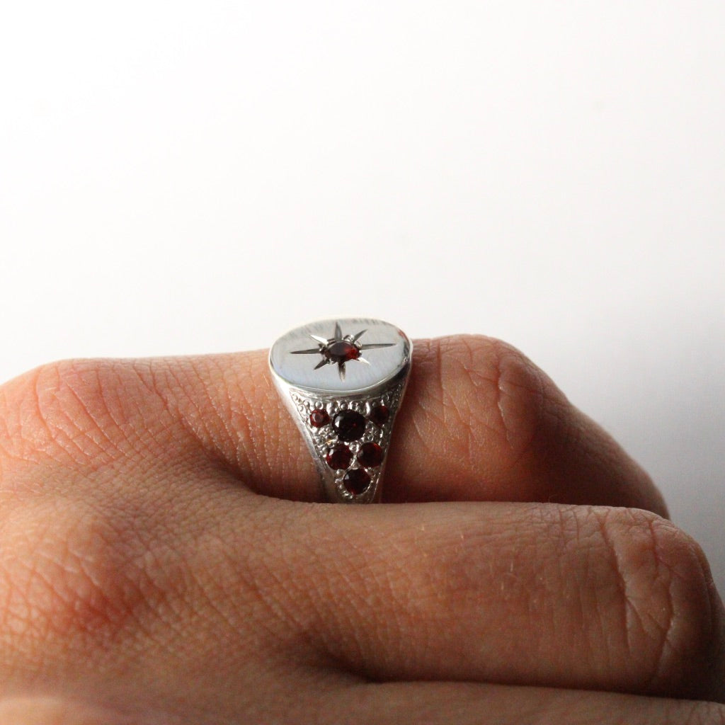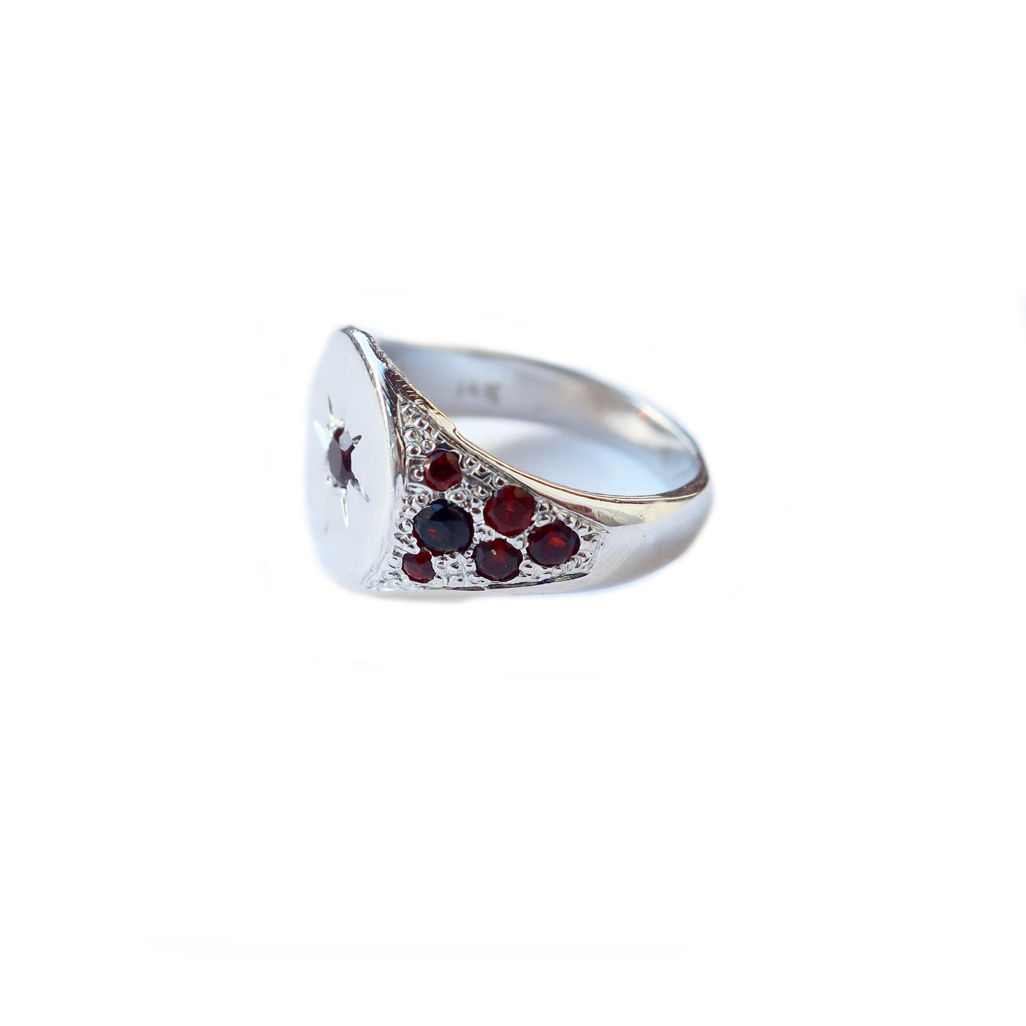 Solid 14k white gold hand carved signet ring with pave garnets. This vintage inspired ring is a wonderful heirloom piece with a timeless design. Top face is 11.5mm in diameter and band tapers from 11- 3mm. Garnets are bead set from 3-2mm ,